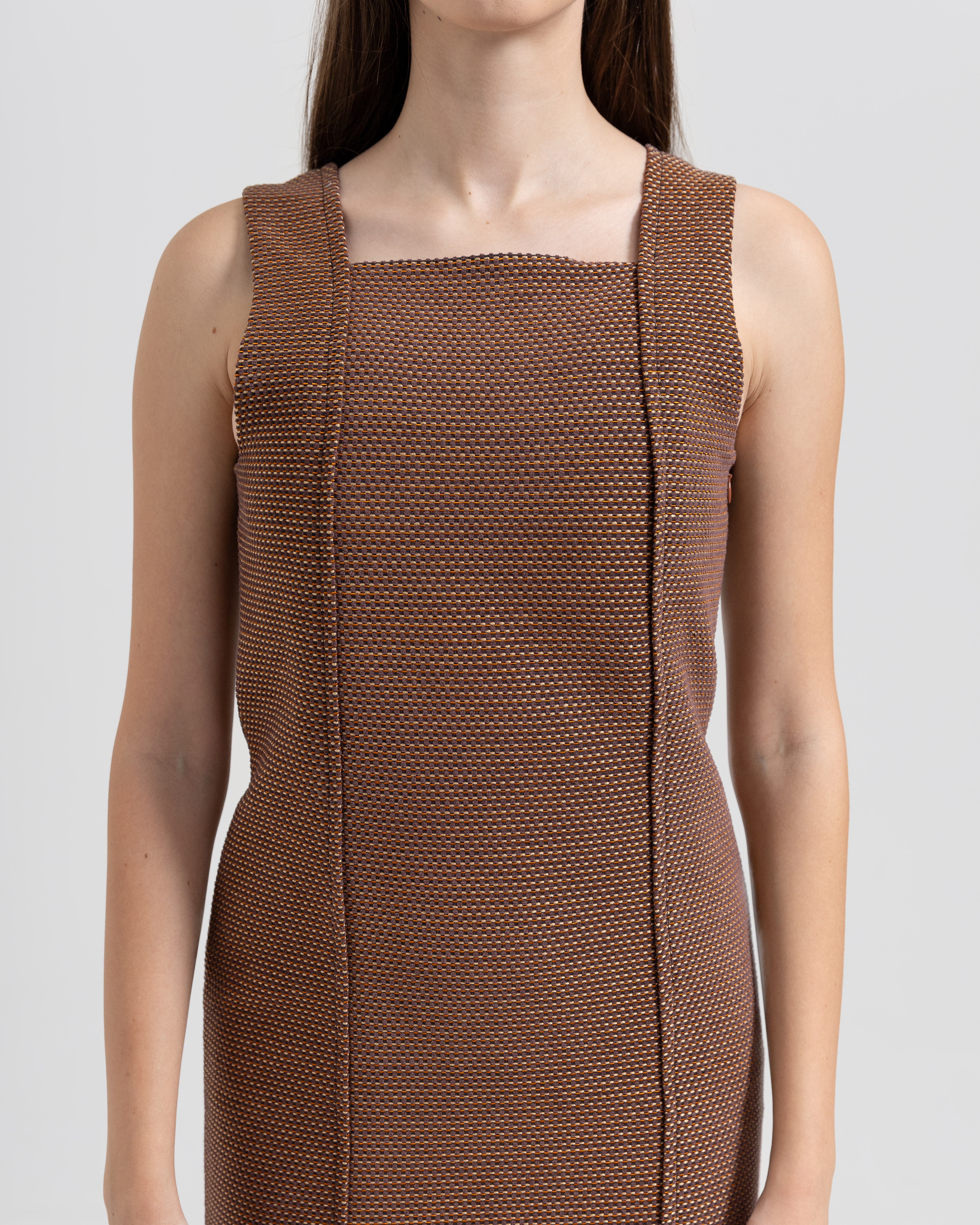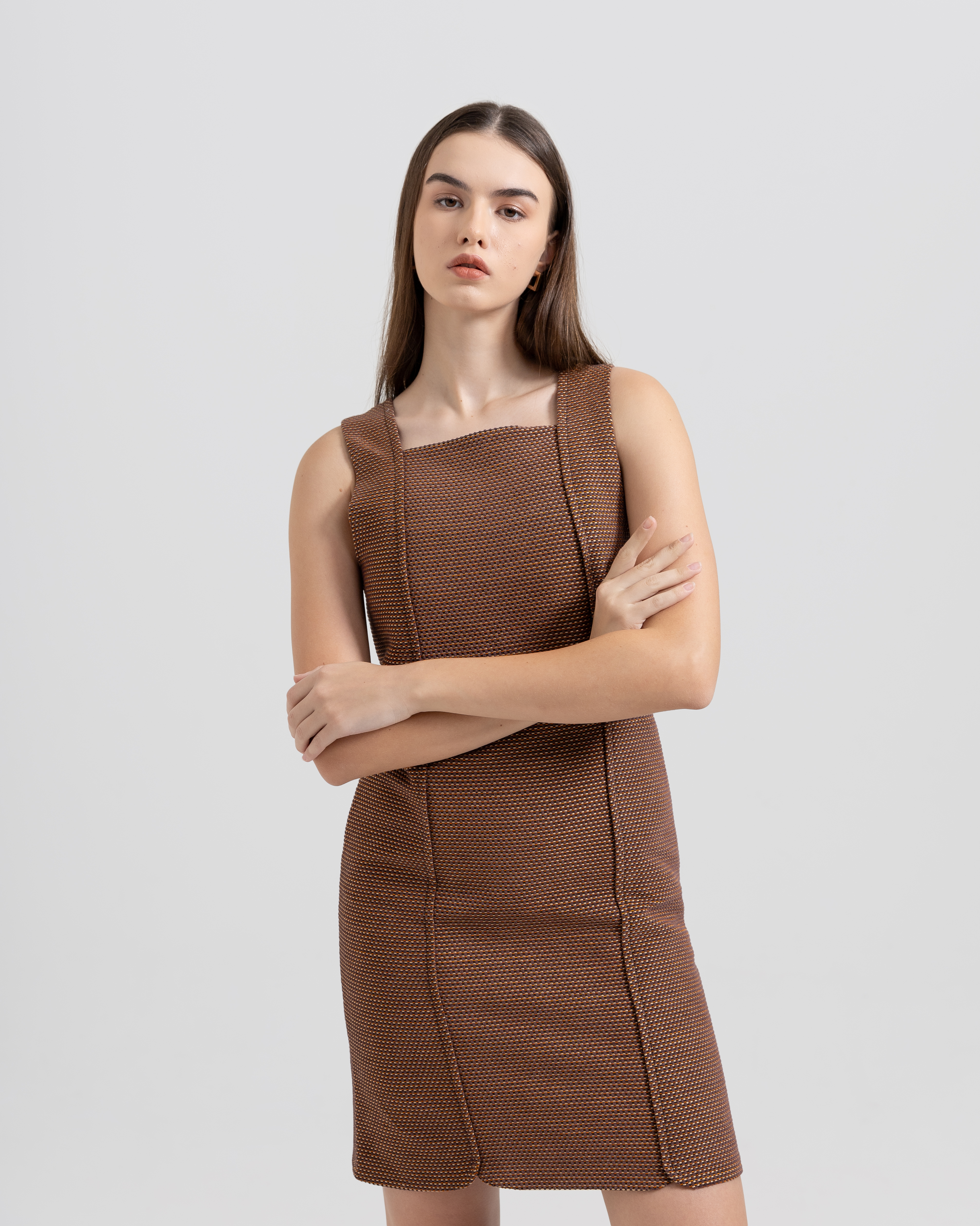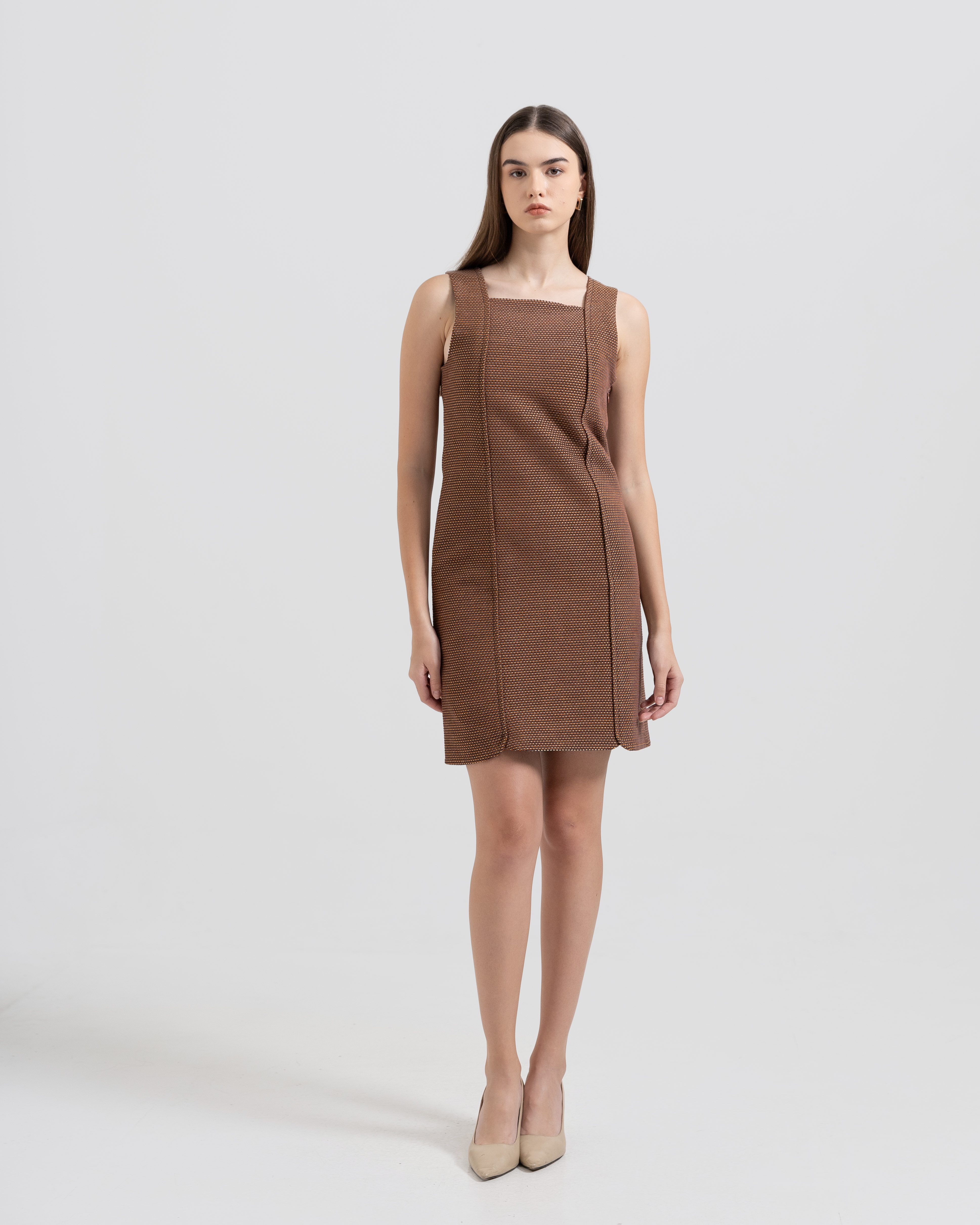 A flowy silhouette with a modern twist. This sleeveless midi dress is designed with a relaxed A-line cut, featuring a unique asymmetric hemline that moves gracefully with every step. Crafted in a rich chocolate brown tone, it’s accented with a minimal button-up neckline and discreet side pockets for effortless functionality.