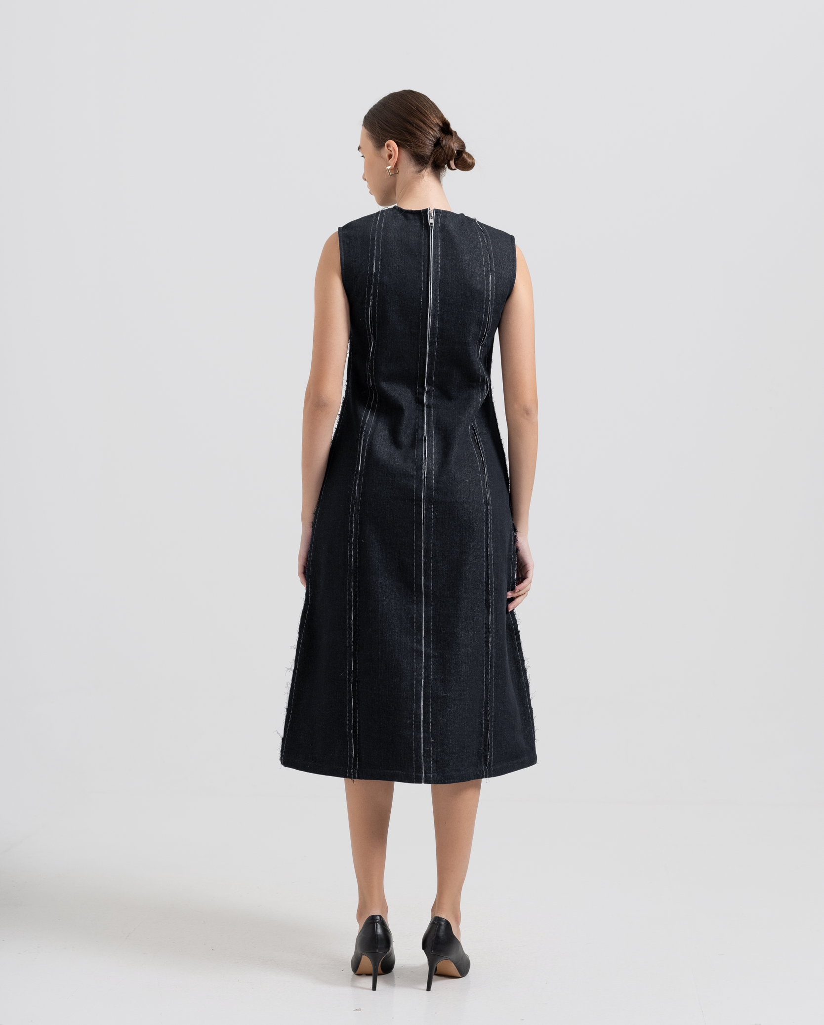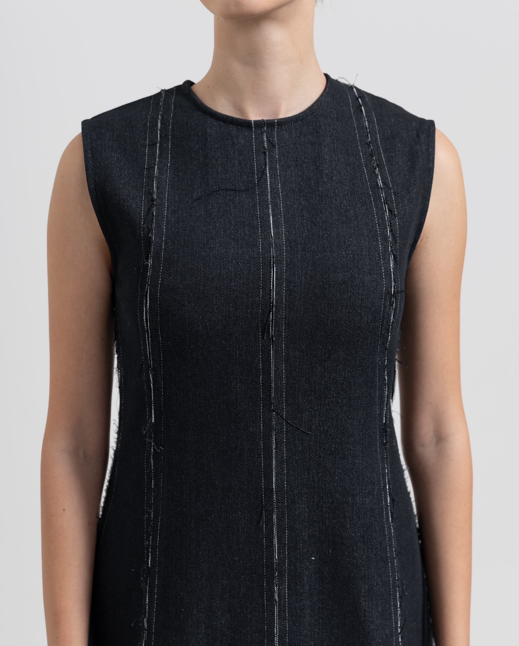 A modern reimagining of classic denim. This sleeveless midi dress is crafted from structured denim with exposed vertical seams that create the effect of layered construction. The raw-edged finish adds subtle texture and edge, while the clean A-line cut keeps the silhouette refined. Finished with a back zipper for ease of wear, this piece balances sophistication with contemporary character.
