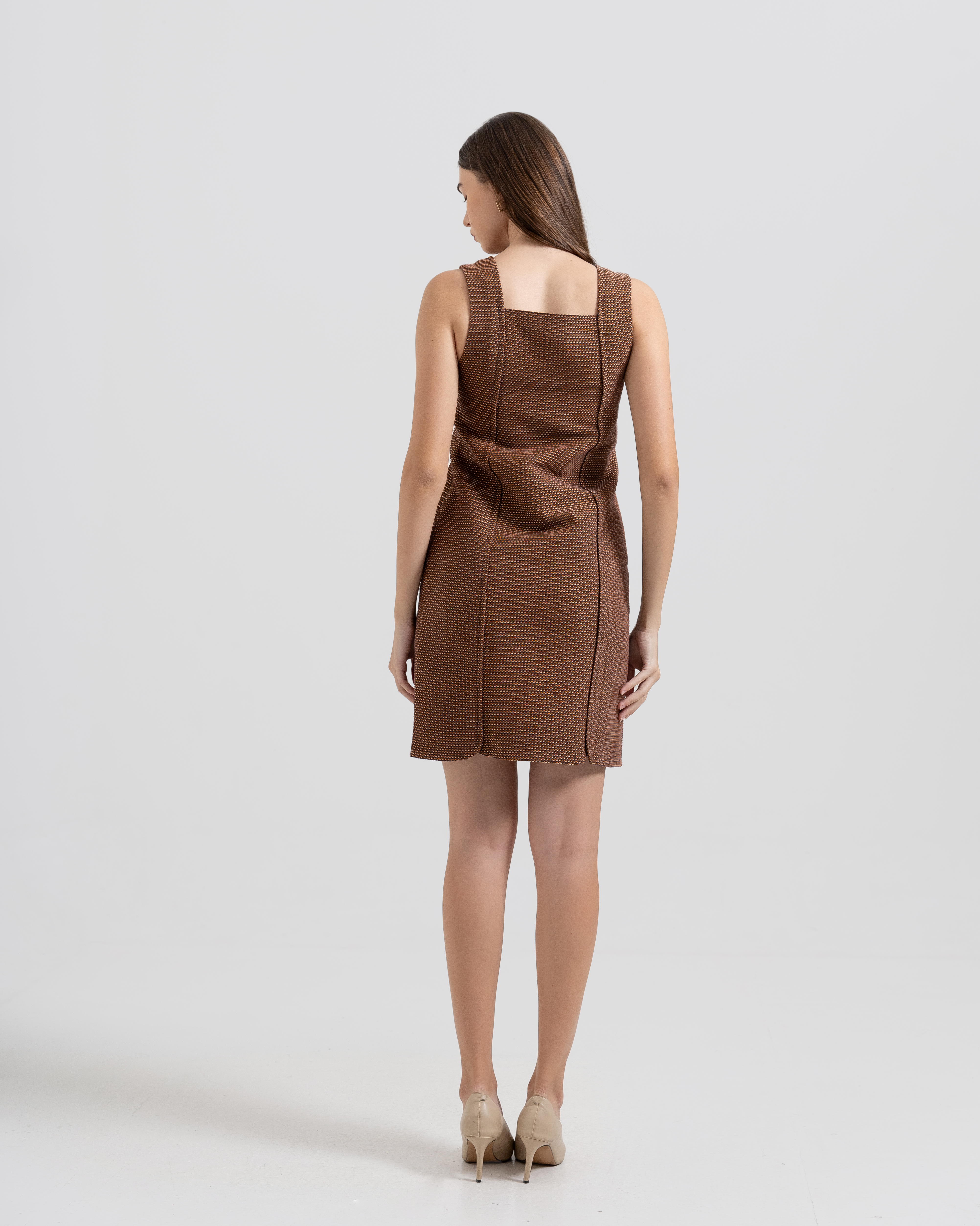 A timeless sleeveless mini dress designed with a clean square neckline and subtle front seam details. Crafted from textured fabric in a warm brown tone, this dress brings effortless sophistication to your wardrobe. Its structured yet comfortable silhouette makes it versatile for both daytime chic and evening elegance.